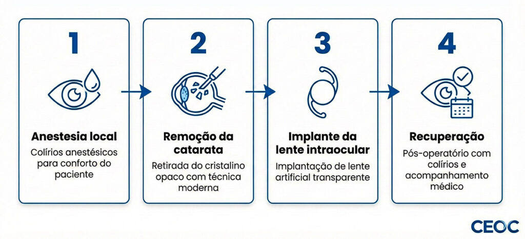 A cirurgia de catarata é realizada, na maioria das vezes, em regime ambulatorial, sem necessidade de internação.